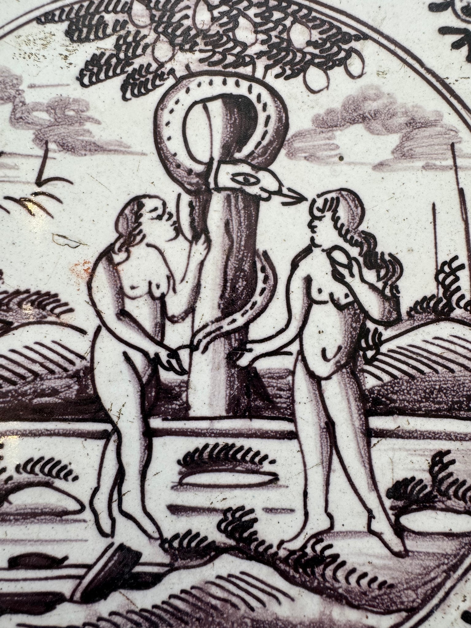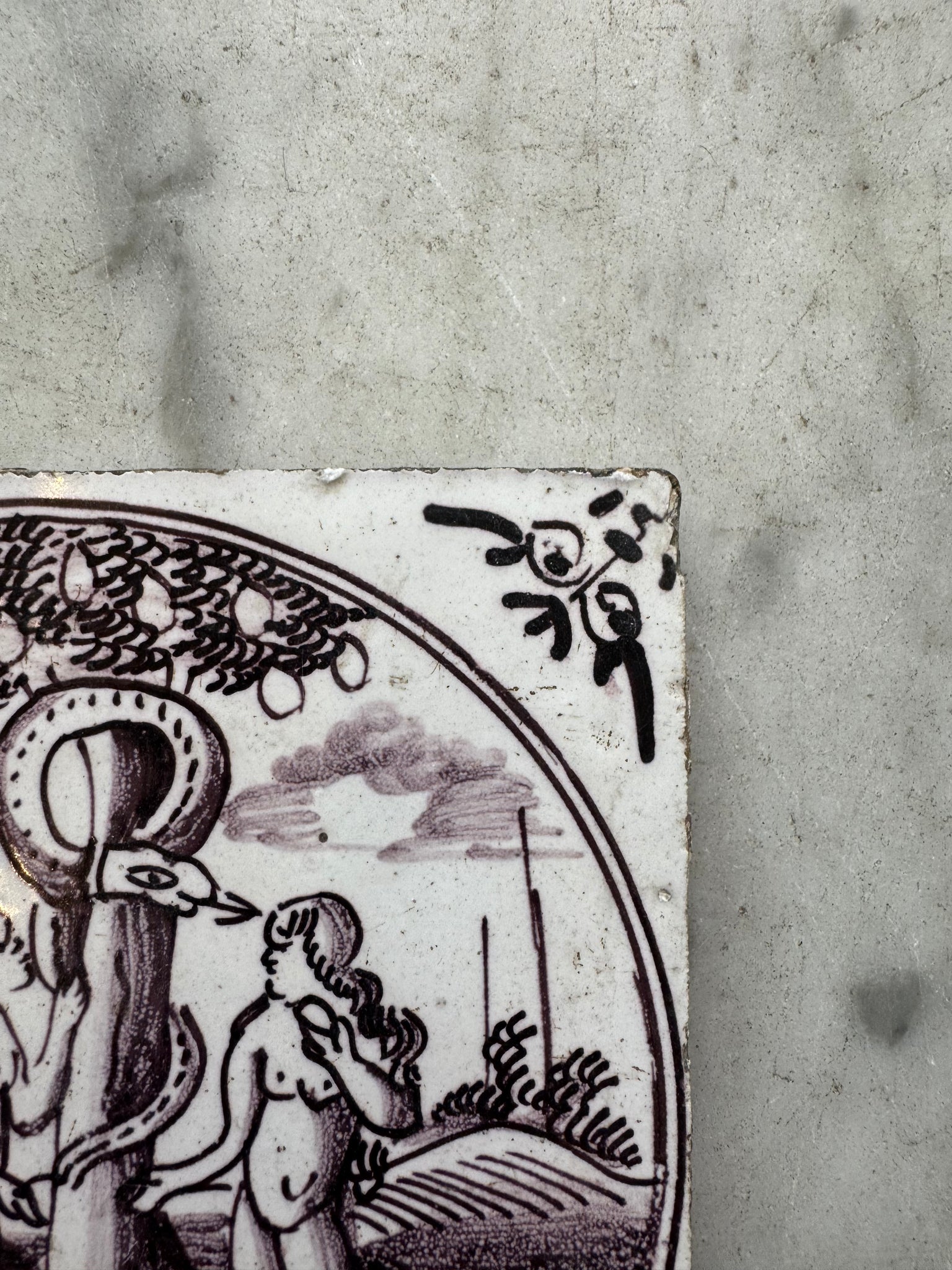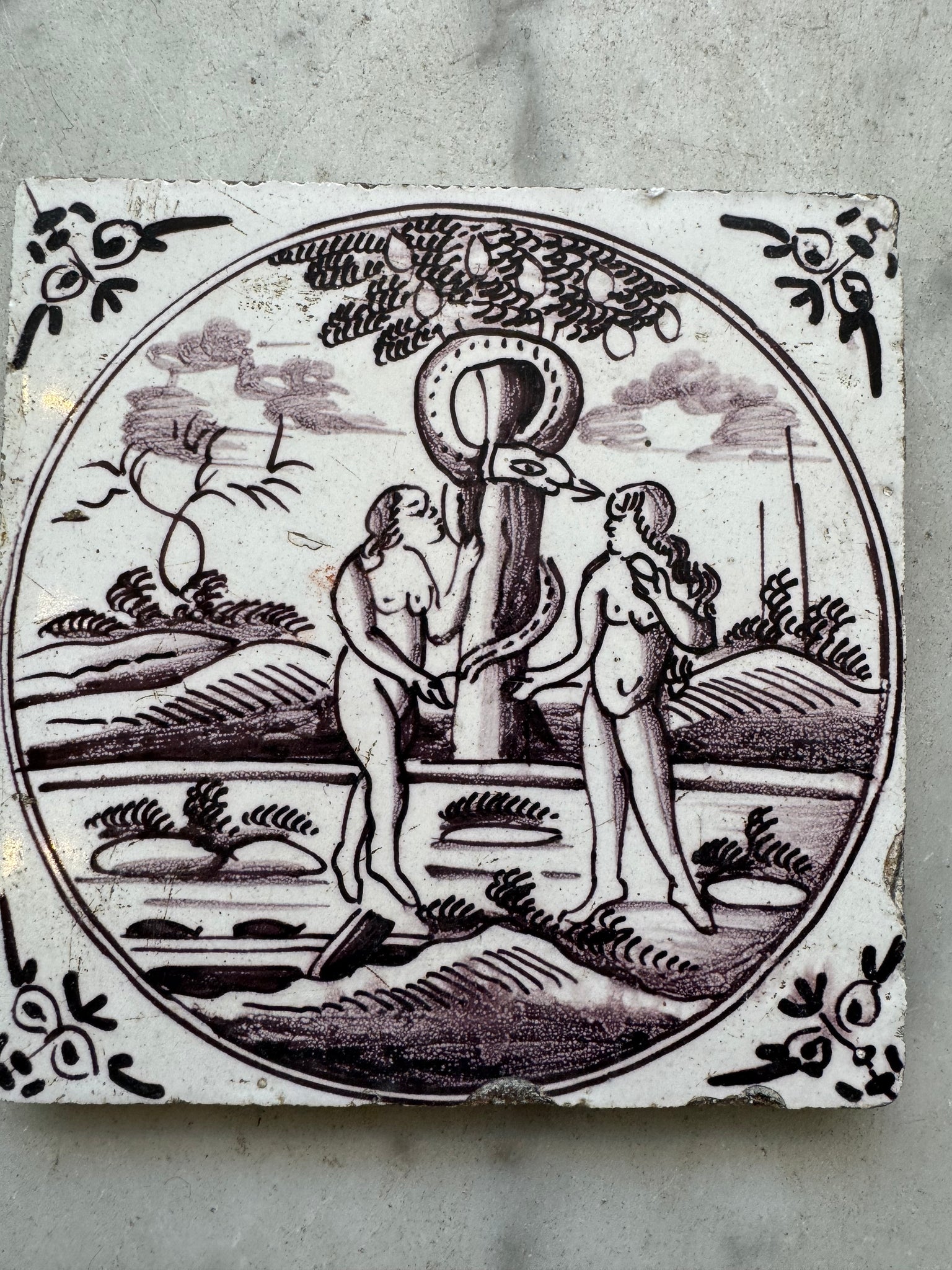 Nice purple 18 th century Dutch delftware tile made biblical tile made around 1760, Adam and Eve